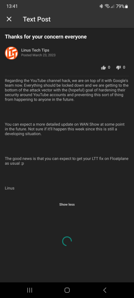 YouTube 已经在第一时间将频道暂停,同时频道的主人 Linus 也表示目前正在和 Google 当局合作,以恢复这个频道,以及加强 YouTube 的安保系统,以避免类似的事情再度发生。