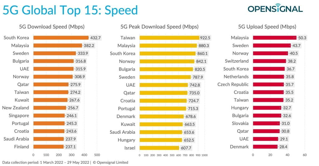 OpenSignal曾在今年6月份的时候释出数据显示,马来西亚的5G速度在下载速度、下载峰值速度都微距第二、上传速度则是世界第一。以 Mbps 为单位,大马的下载速度为 382.2Mbps,仅次于 432.7Mbps 的韩国,排在第二位;而我国的 5G 网络峰值下载速度更是来到 880.3Mbps,仅次于 922.5Mbps 的台湾;反倒是 5G 网络上传速度,大马则是以 50.3Mbps 坐享全球第一。