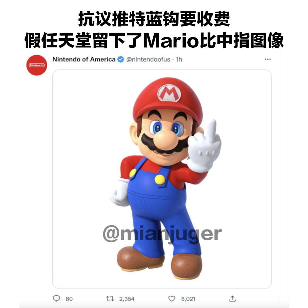 为了抗议马斯克接管推特之后,蓝钩(Blue Tick)只需要付费就可以获得,一个名为 @nlntendoofus 的用户就假冒自己是任天堂的官方推特,并在推特留下了 Mario 比中指的图像!