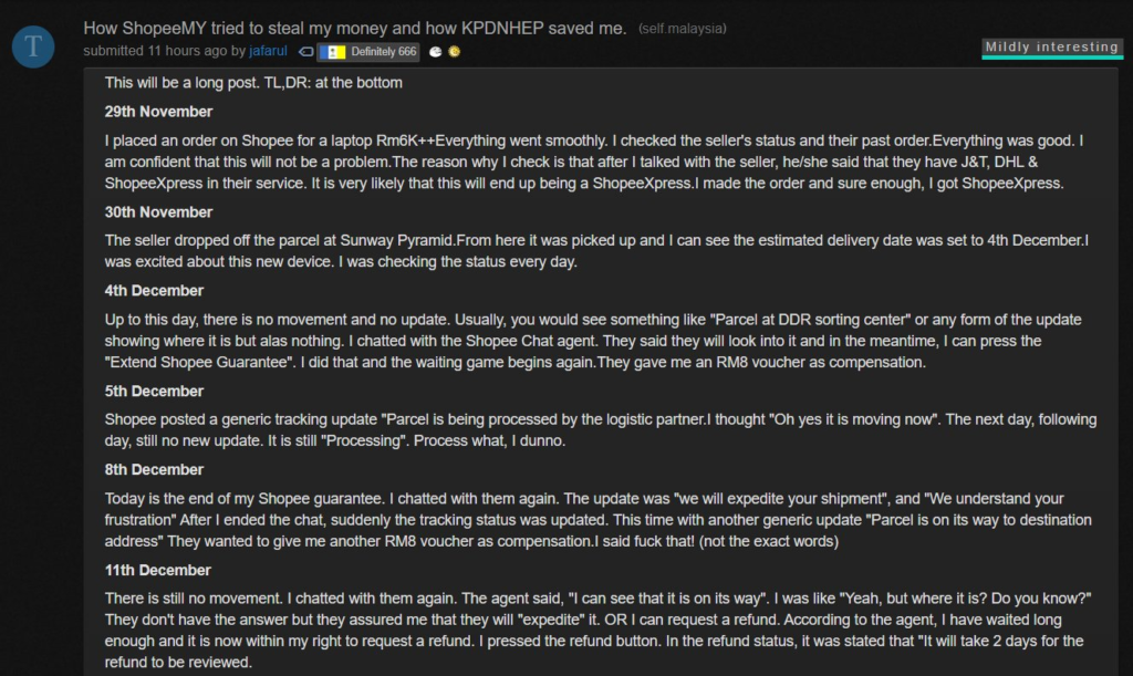 最近 Reddit 上就有网友分享,他在11月29日于 ShopeeMY 平台上购买了一台价格超过RM6000的笔记型电脑,却疑似因为 ShopeeXpress 丢失包裹的缘故,造成他的笔记型电脑迟迟没有抵达。