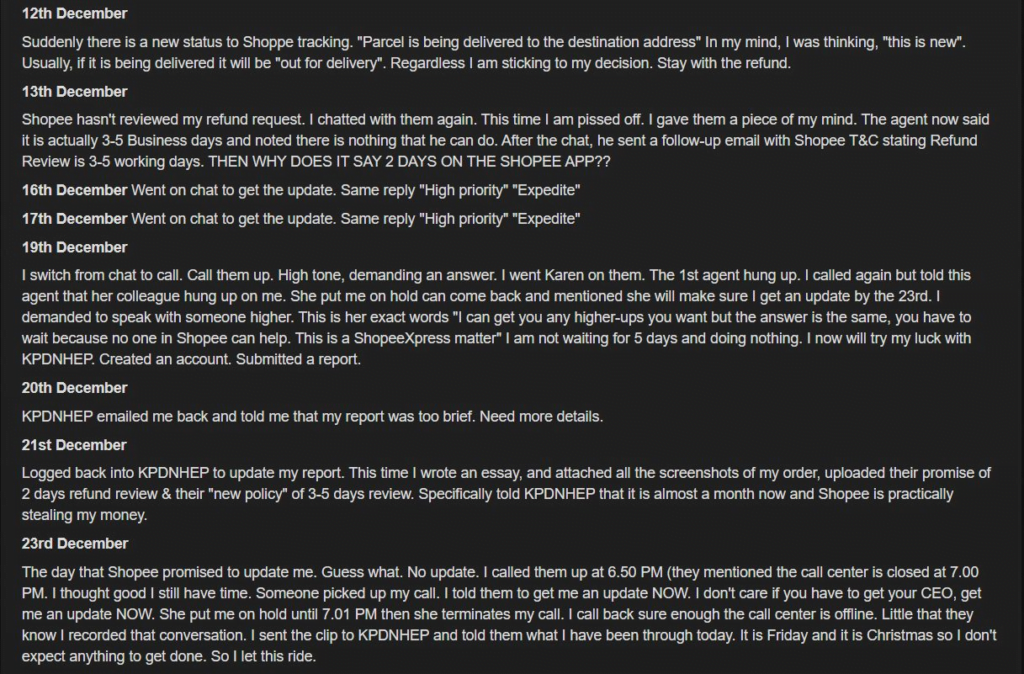网友在过了 Delivery 期限一段时间后,启动了 Shopee 上的退款,却被 Shopee 客服人员百般刁难、推来推去。无论是通过 Shopee LiveChat、还是Shopee客服专线,都退款无果。最后客服人员甚至强制挂断客服电话,令网友非常不满。