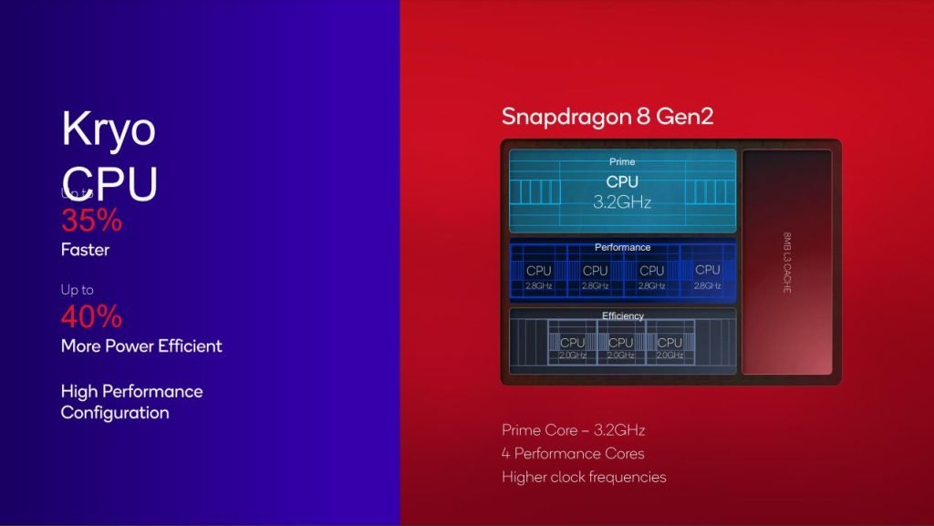 据了解,骁龙8 Gen 2将会采用台积电4nm工艺制程铸造,不过在核心上将会有所调整。悉知,全新的骁龙8 Gen 2将会采用基于 Cortex-X3 打造的 Kyro Prime 核心作为超大核,工作频率为 3.2GHz;另一方面,骁龙8 Gen 2将会采用四个性能核心以及三个节能核心的组合,并预计可以让芯片的运算速度提高35%!