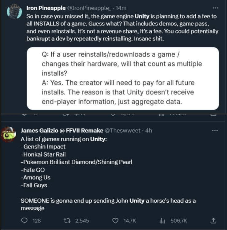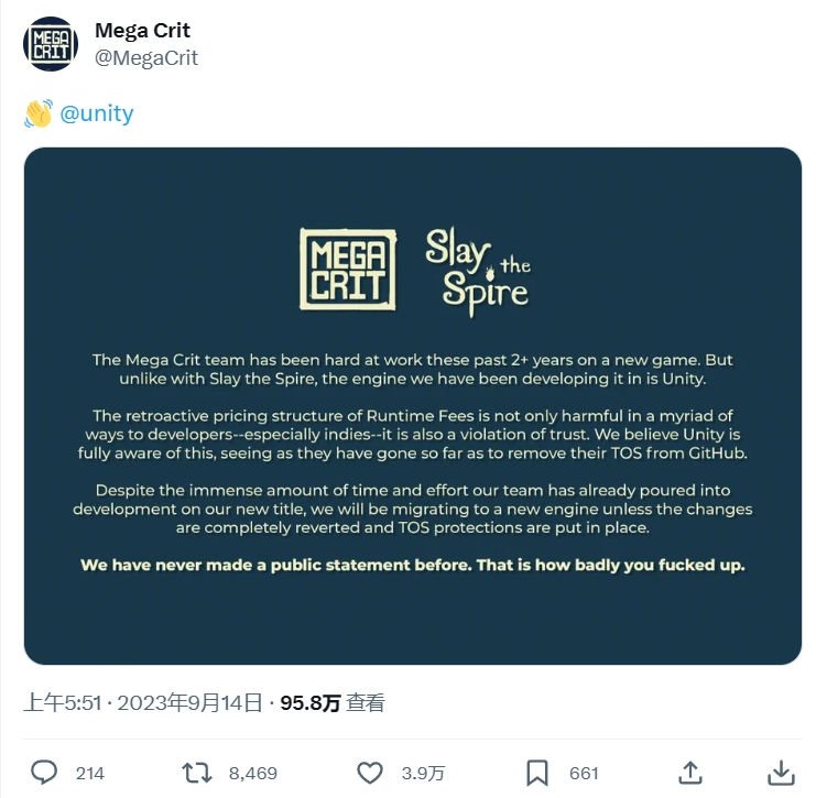 这项举动让不少游戏开发者表示非常恶心,其中一家名为 Mega Crit 的游戏开发公司表示,虽然目前已经有一款游戏已经开发了两年之久,但由于Unity将收费价格改至不可理喻的地步,因此他们将不再使用Unity 引擎制作游戏,而是会转移至其它游戏引擎。