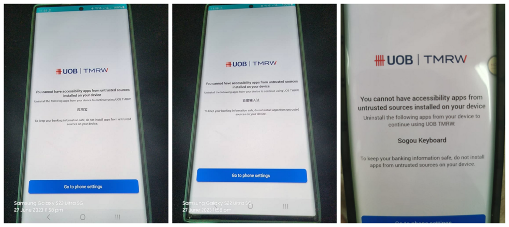 根据不少网友在 Lowyat 论坛上的分享,UOB TMRW APP 竟然具备了扫描用户手机上安装了什么软件的功能,倘若遇上一些来自第三方的软件,UOB TMRW 将会强制用户删除哪些软件,否则将不可以使用 UOB TMRW 软件!